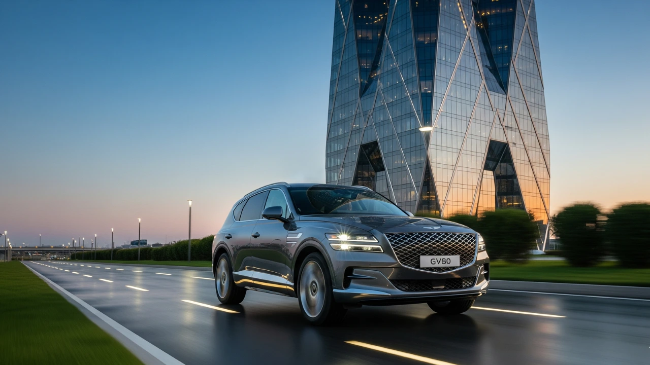 Genesis GV80 midsize luxury SUV in motion on a city boulevard at dusk, showcasing crest grille and quad LED lamps with a glass skyscraper backdrop