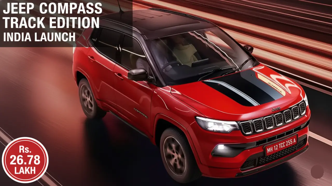 Jeep Compass Track Edition India launch image showing red SUV with hood decal and ₹26.78 lakh price.