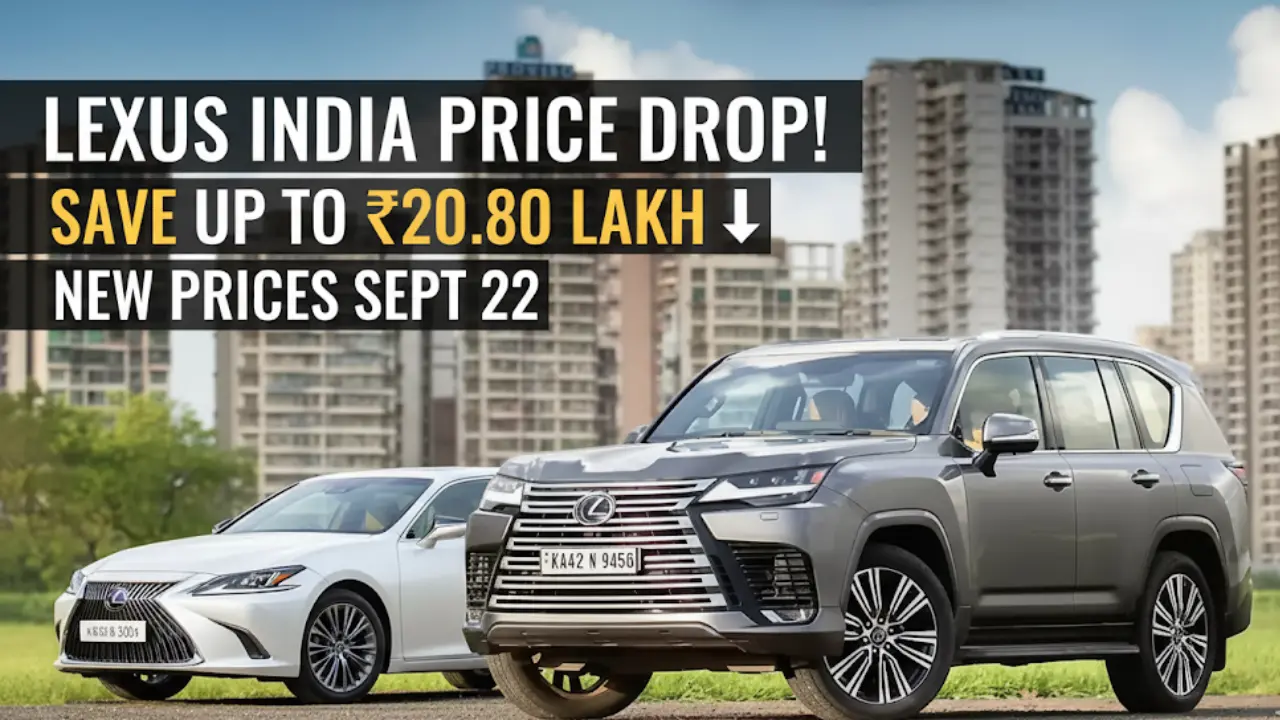 Lexus LX 500d SUV and ES 300h sedan with “Price Drop” banner, highlighting up to ₹20.80 lakh savings effective September 22 in India