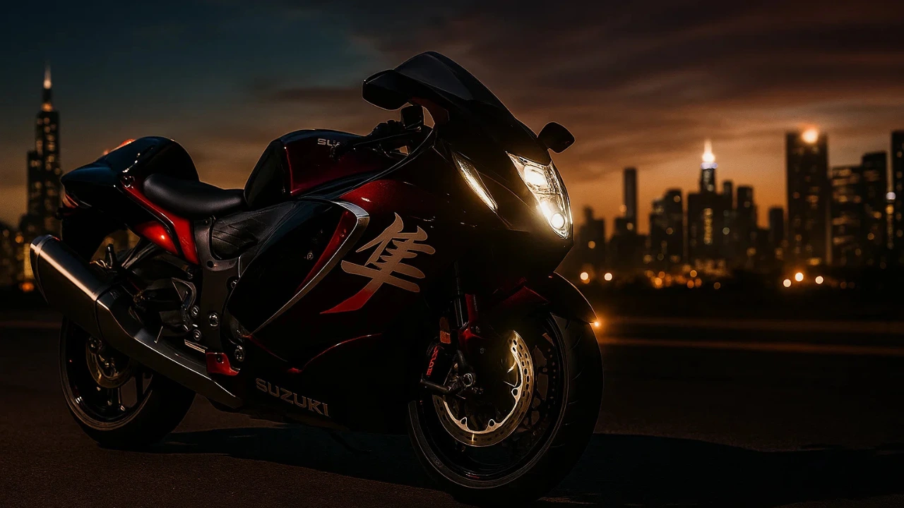 Hayabusa 2026 update superbike with black and red body parked under city skyline at night