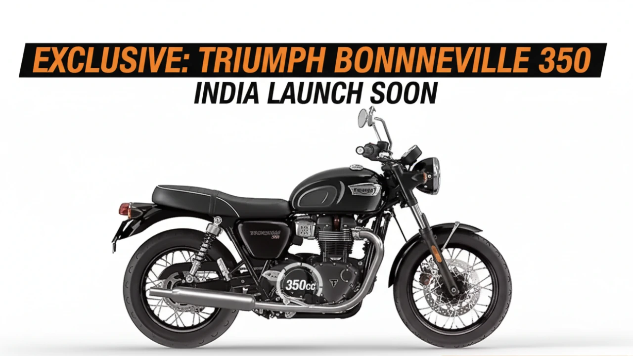Exclusive: Triumph Bonneville 350 India launch soon banner showing a black retro motorcycle with wire-spoke wheels, labeled 350cc, positioned as a Royal Enfield challenger.