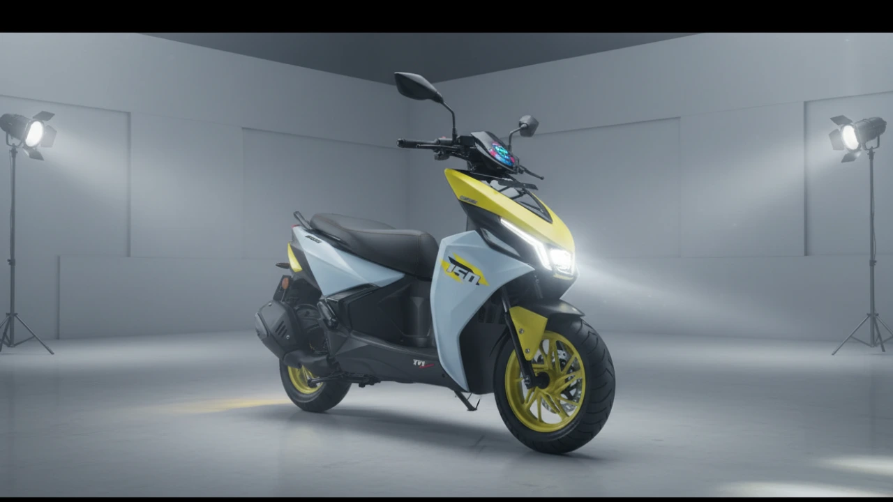A yellow and white TVS Ntorq 150 scooter is showcased from a front three-quarter angle in a modern photo studio, with its aggressive headlight illuminated.