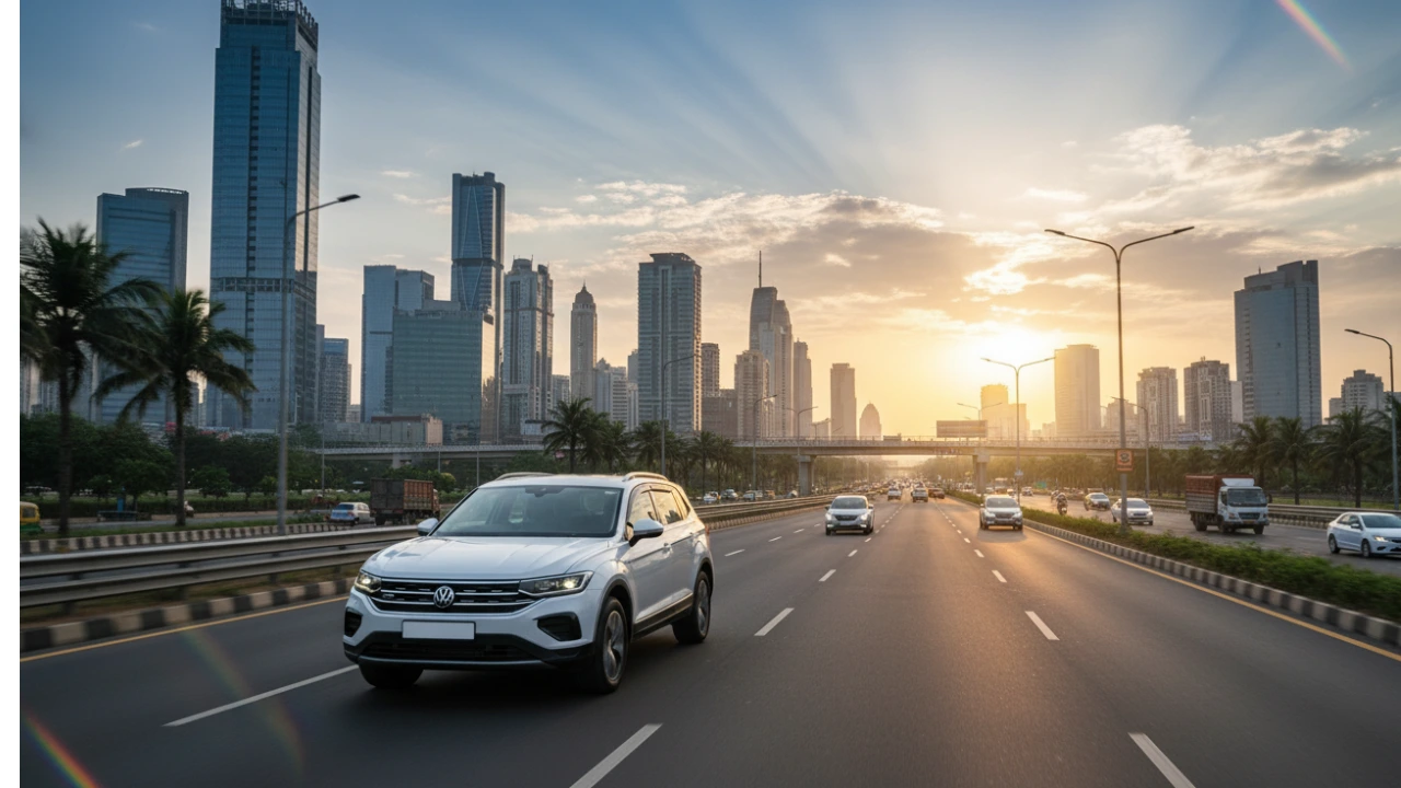 White Volkswagen SUV driving on a multi-lane urban highway at sunset in India, with palm-lined median and high-rise skyline in the background.