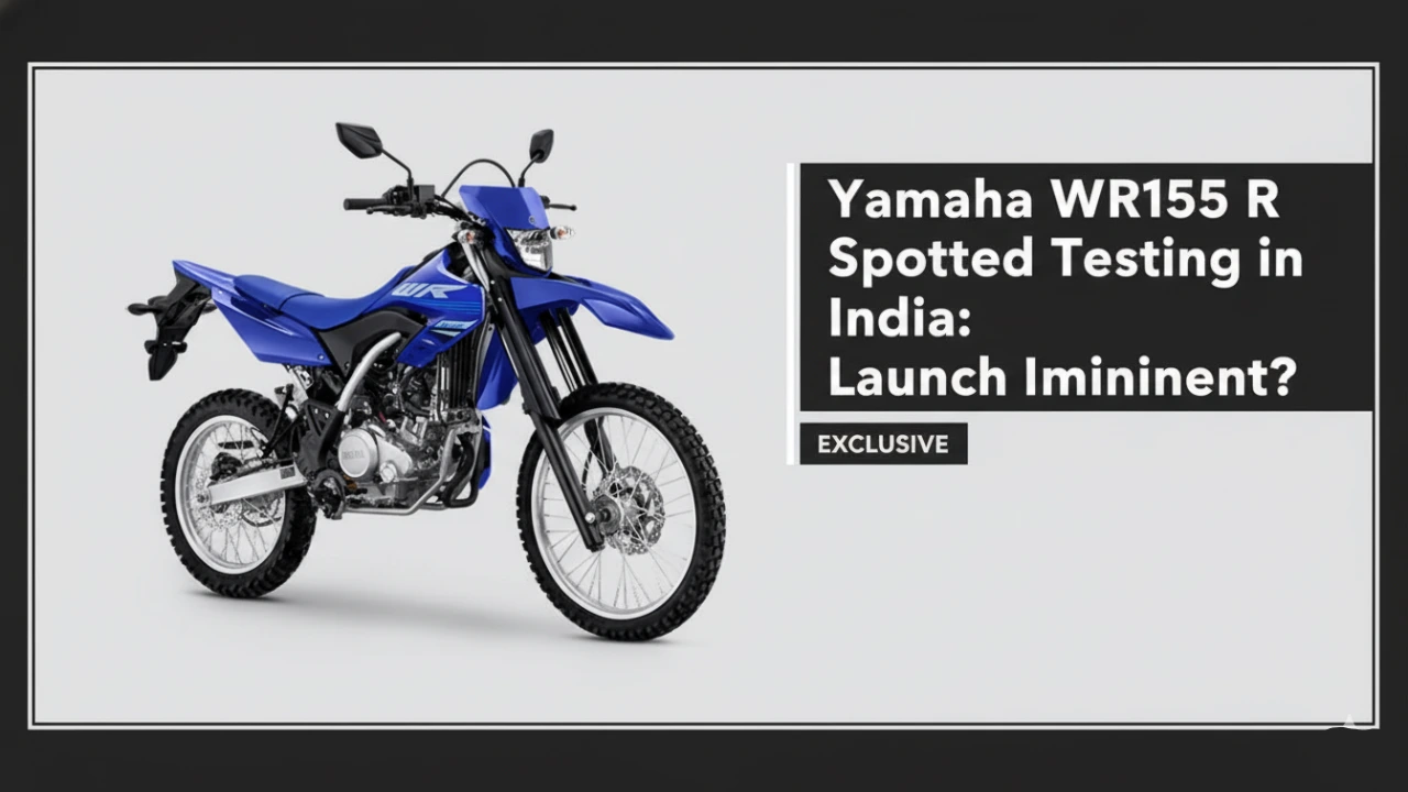 Blue Yamaha WR155 R motorcycle with text "Spotted Testing in India: Launch Imminent?" for news on its India debut.